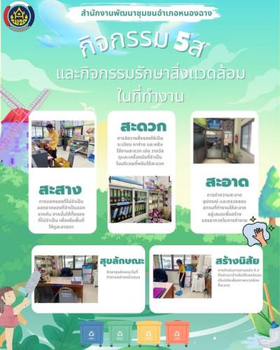 ร่วมกันดำเนินกิจกรรม 5ส (สะสาง สะดวก สะอาด สุขลักษณะ สร้างนิสัย) ประกอบด้วย การลดและคัดแยกขยะ มูลฝอยในหน่วยงาน และลด ละ เลิก การใช้โฟมบรรจุอาหาร (No Foam) การส่งเสริมการใช้ถุงผ้า ตะกร้า ปิ่นโต ภาชนะหรือบรรจุภัณฑ์ที่เป็นมิตรกับสิ่งแวดล้อม เป็นประจำ